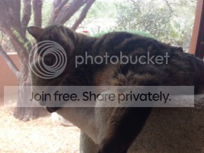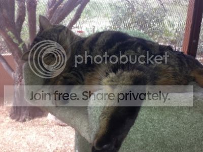 The little Principessa did well with the company last night; of course, she's known all these friends since she was a baby so she's pretty friendly about it all. All the kitters did "cat time" on the catio with me this morning as the mornings have been so nice and cool lately and the solar shade keeps it even cooler. She was in one of the trays on her condo and had her leg all flipped over like she likes to sleep (see photos below) and she was rolling upside down, purring, acting like a happy girl. She appears to just have one ear in the second photo but I caught her in mid-head roll :lol: :lol:
