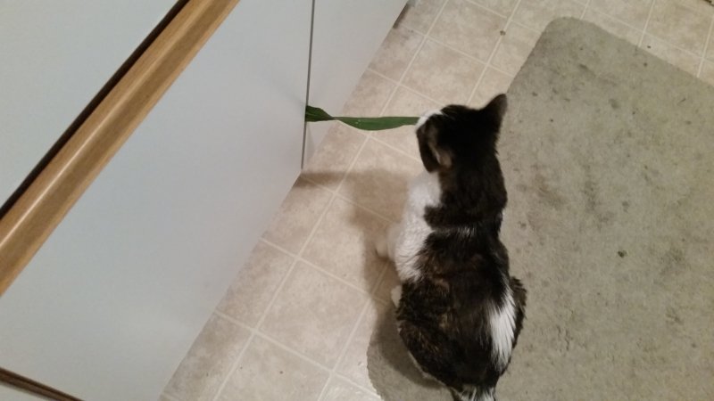 MissP is delighted because I brought fresh Colorado sweet corn home from the store. She goes crazy for the stalks. See pic. Doesn't care for the corn itself, just the stalk. I have the cabinet doors holding it for her so I could unload the rest of the groceries. Silly gato. Head bumps and scritches to all.