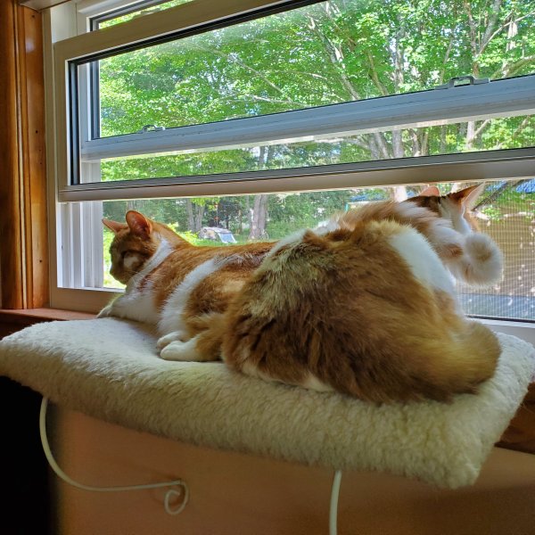 I wanted to add a couple pictures that show how these critters keep you guessing... got home and he and his brother were crammed onto one window seat, which is odd these days.