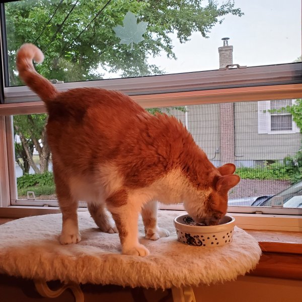 Supper time, the only way Toeby would eat for me was if I put his dish of Blue Wilderness (which he seems to like) up on his other window seat, on his own.