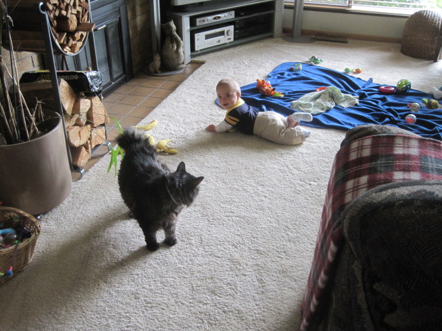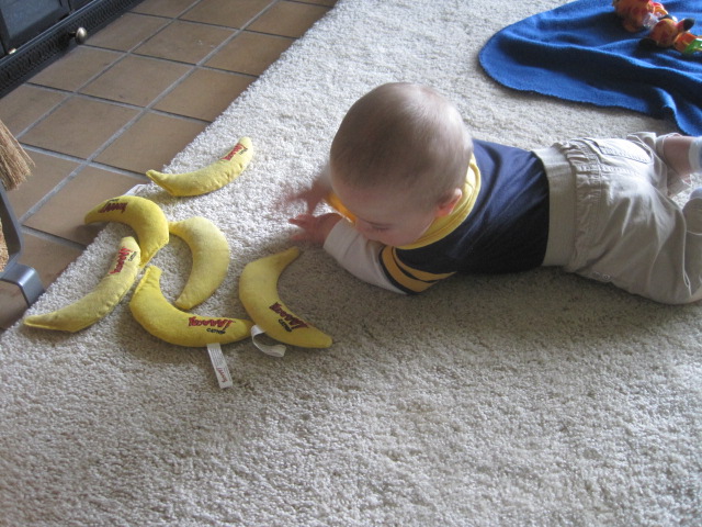 Below are a couple of photos of Mannie, DGS, and the toy stash(es). What was so fun was that as DGS approached the nanners, Mannie looked at him, backed up a few feet, and let him have them. :shock: :shock: sharing... who would have think that? It was about this point that the bean intervened... ugh: nanners in the mouth. uhhhh... no.