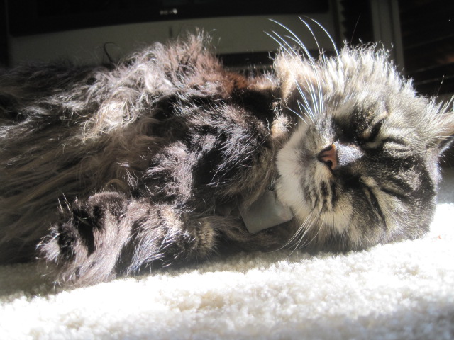 All is well in MannieLand. :-D :cool: :cool: With all those pokies yesterday, there was never one complaint. he came for his tests, let me know when he was too low and in the 30's, ate all I asked him to eat, accepted little sleep. By mid afternoon the sun had come out, his numbers were up some, and there was this sunbeam that was streaking through the living room window. That is where I found him after DGS and I returned from our walk: stretched out by the nanners, soaking up every inch of that sunbeam. When it moved as the sun moved, he moved with it. I took this photo of one very tired and poked out kitty. :razz: ah well.... the kitty choir today! absent one member this morning. Seems the Nanner King spent the night on the pile, and that is where I found him in the morning, after the choir woke me up. BJ was in prime form: this morning not only did I get ear piercing bellows in my ear, I also was blessed with claws to the shoulder and a wet nose on my cheek. :shock: shessh! I got up out of desperation! :lol: :lol: We had successful test feed shoot, once I woke him up that is. And he was purring! He was ready to start the day - back at it for a new start, new dose, hoping for great things. Normalcy: life is indeed good. :-D