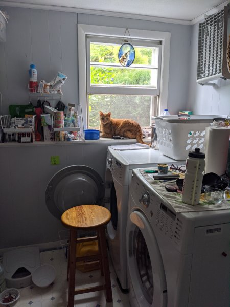 We have a scale for measuring Kit's food. Today after her vomit session, I gave her 5X 0.5 oz FF pate portions at intervals. She kept the food down and has been fine since. She's not a barfy cat, not sure what "got into her". ; ) Your laundry room seems like a great space. As long as a cat has an open window, they are pretty happy!