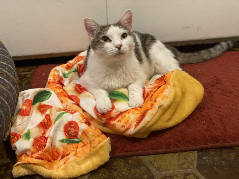 It is pizza! It’s a bed and blanket combo! I couldn’t resist.So cute - is that pizza? Hope you and kitten have a wonderful weekend!