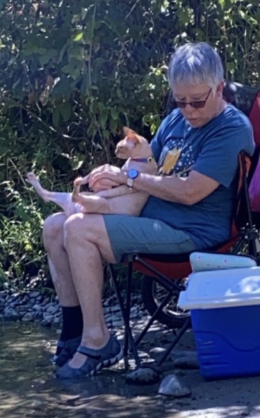 Today’s Daily Disco photo shows him stretching out his toe beans so I can get his BG, even while we were relaxing at the river side...