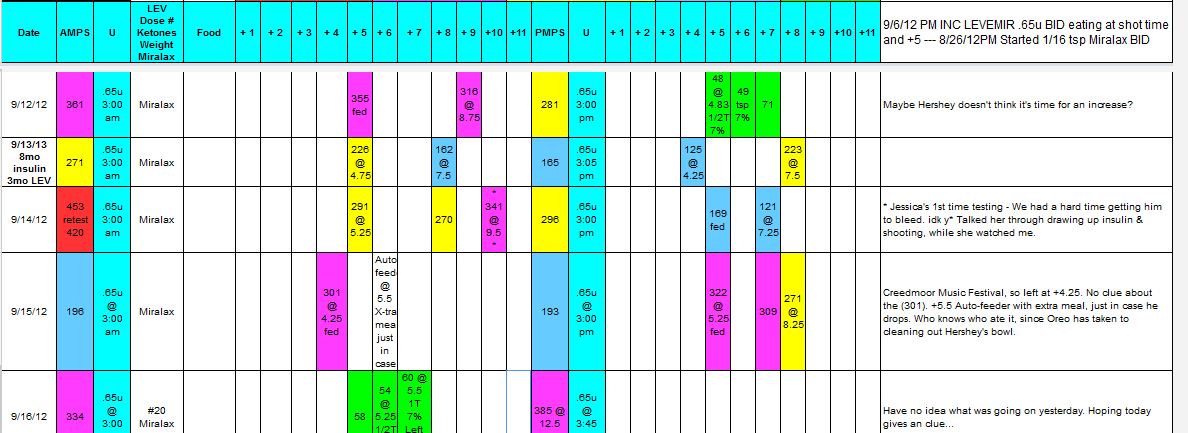 - The 15th started with a BLUE AMPS, so I figured the wonky day was over. (paha) +4.25 was PINK, but I thought maybe the insulin was a little slower onsetting. I was just happy not to have to worry about him since I'd be gone the whole cycle. Left a +5.5 meal in the auto-feeder, just in case he dropped. It was empty when I got home, but have no way of knowing who ate it and I've seen Oreo going to town on Hershey's food a few times lately. Blue PMPS, well that's good! +5.25, back to PINK. confused_cat +8.25, finally down to YELLOW...scratching head...Need to get through Sunday morning, then we can INC, if necessary...