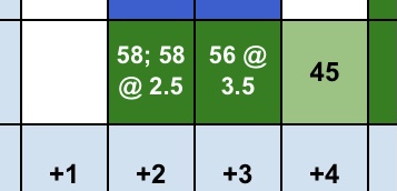 So in the +6 column you would put the 85 and right underneath that in the same square (cell) you would put 97 @+6.5