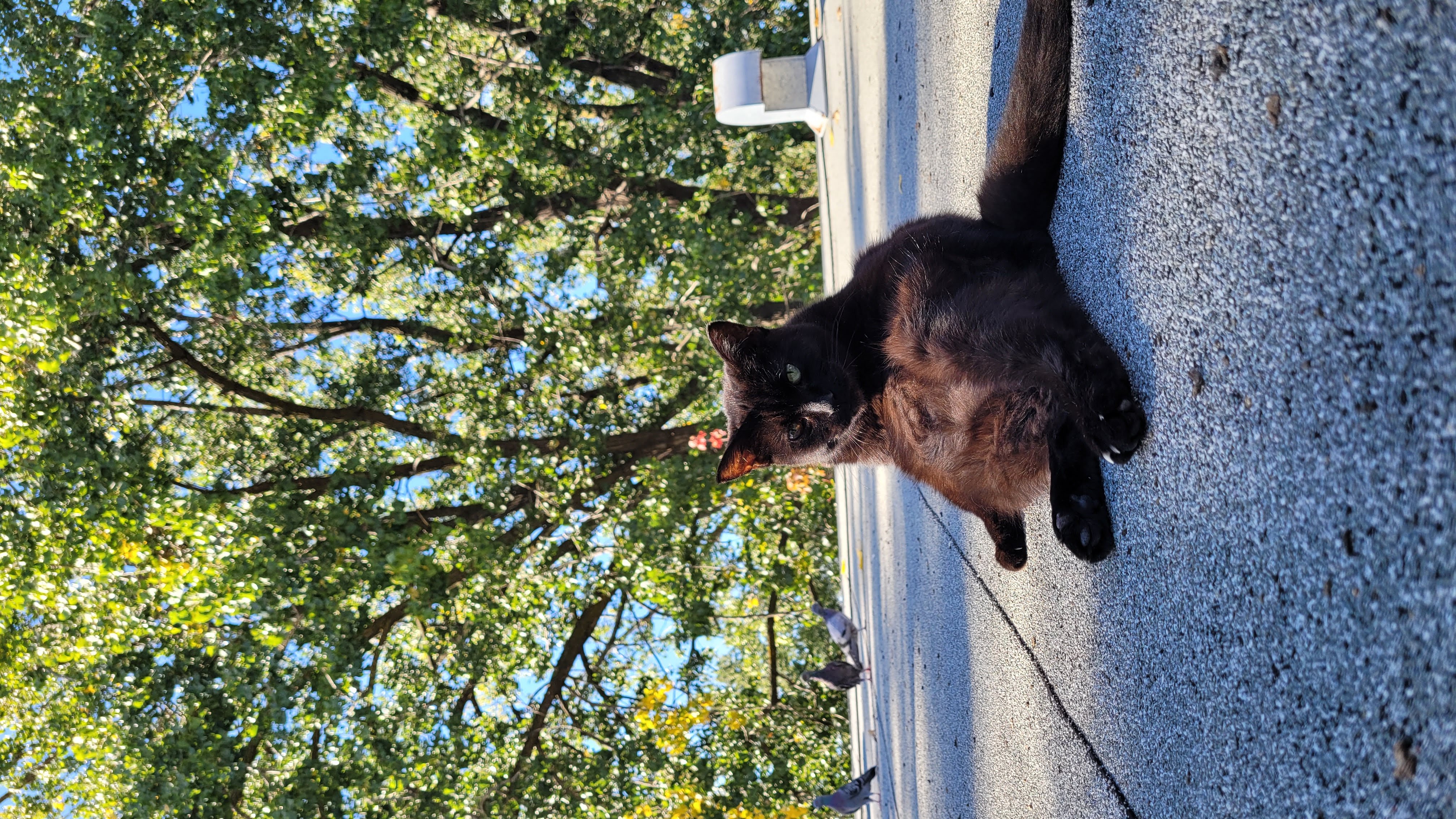 Lu on the warm roof, with wary pigeons in the background.