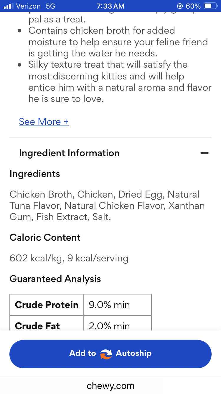 Regarding Churu — the Tiki Cat Stix are a better choice as they don’t contain Tapioca Starch. Here are the ingredients for the chicken one:
