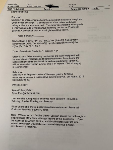 Alice goes back next Wednesday to have stitches removed, so that will be a chance to visit and discuss and I asked my vet to write up some treatment plans and recs.