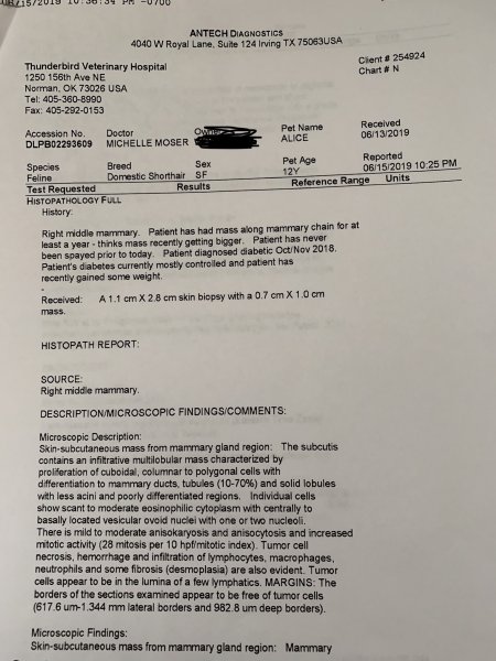 Not the diagnosis you were looking for but those clear margins means that all the tumor was removed. First good step. Potential just means potential. Did she have all the mammary glands removed?