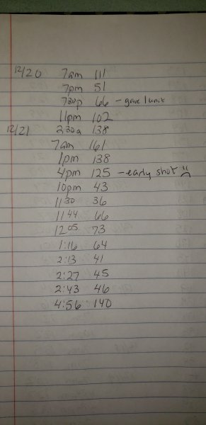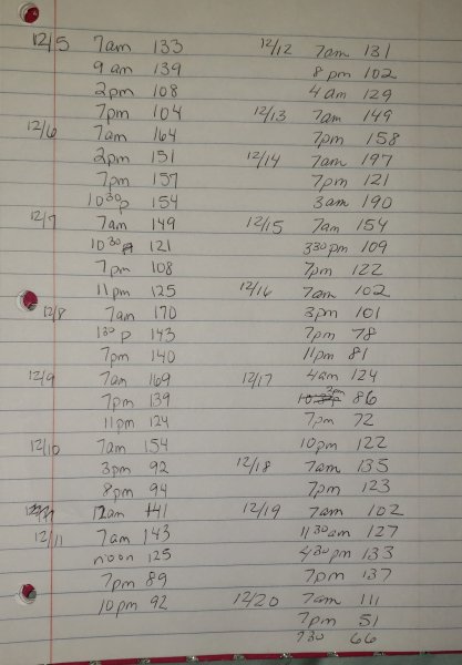 We went to a Christmas party last night and I stupidly thought it would be ok to give his shot 3 hours early at 4 pm instead of 7pm. His BG is usually very stable and I thought it would be Ok. We got home from the party at 10pm and he was at 44 and then 36. I was up most of the night testing, feeding him stuff and mixing in honey and icing. I tried some of the emergency gravy food I had on hand at first but he threw it all up 40 minutes later like I knew he would. His tests all night were from 66 and 77 down to 46 again. Through it all he was asymptomatic and normal if a bit hungry.