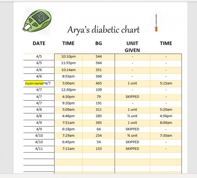 Arya (16 years old) was diagnosed with diabetes on 4/5. She was started on Lantus on 4/7: 1 unit twice daily. She gets tested before breakfast and dinner using the Alpha Trak 2 glucometer. She was started a low carb diet on 4/6 (fancy feast patte/ classics, friskies chicken patte). I've attached a picture of her chart I made for her BG readings along with insulin doses given. Sometimes her BG drops pretty low but she's alert and happy. Any thoughts on why she may be a once daily insulin kind of cat?