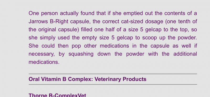 I was able to mix the b complex directly into CC'S food. I would empty the capsule into a small pill container, then use the pinch size spoon and add it into her food. These are the spoons. 2lbDepot Measuring Spoons Set of 3 (Tad 1/4 teaspoon, Dash 1/8 teaspoon, Pinch 1/16 teaspoon), Chrome Finish, Premium Heavy-Duty Stainless Steel, Narrow, Long Handle Design Fits in Spice Jar https://www.amazon.com/dp/B079TDP8D8/?tag=felinediabetesfdmb-20