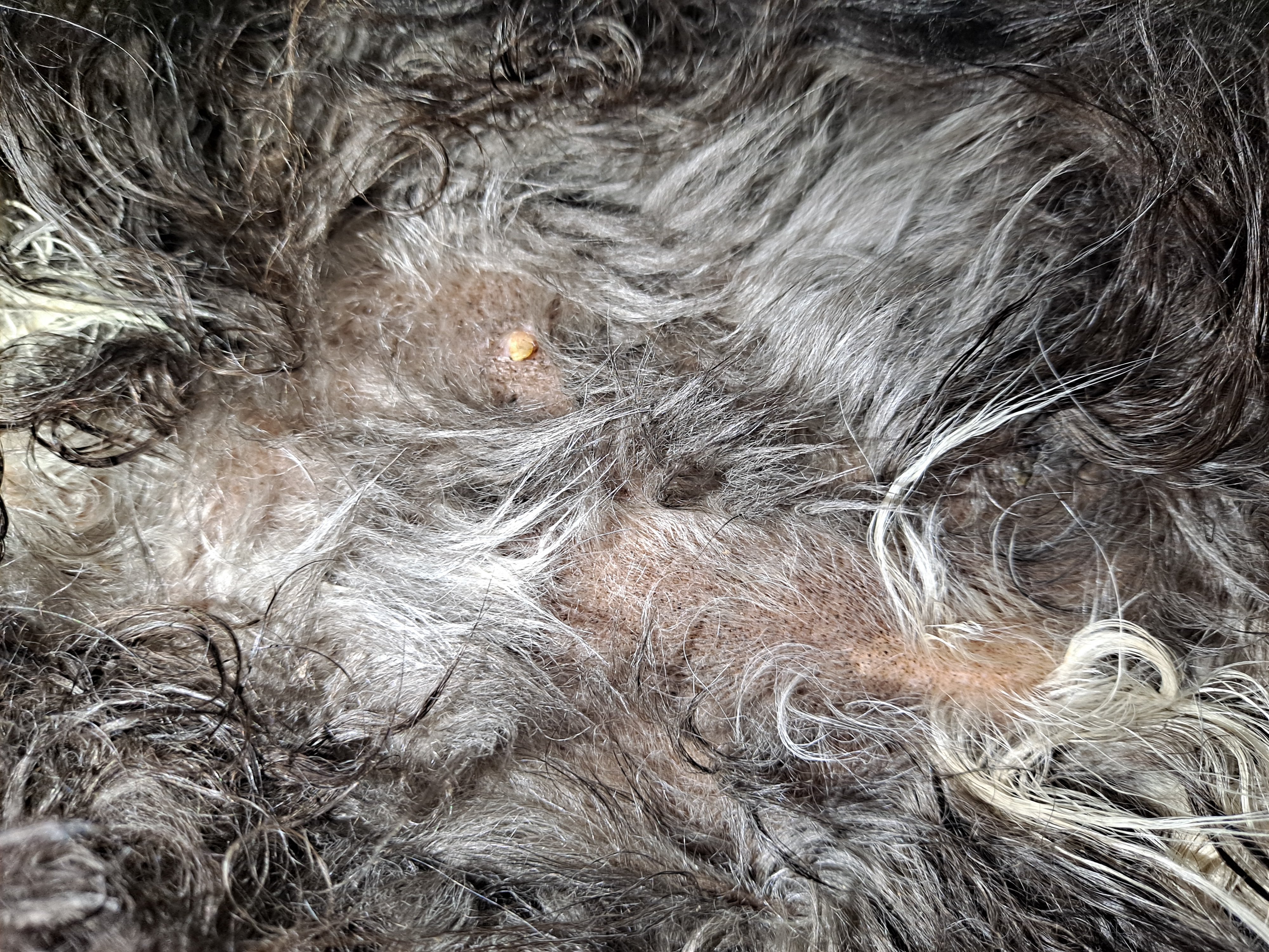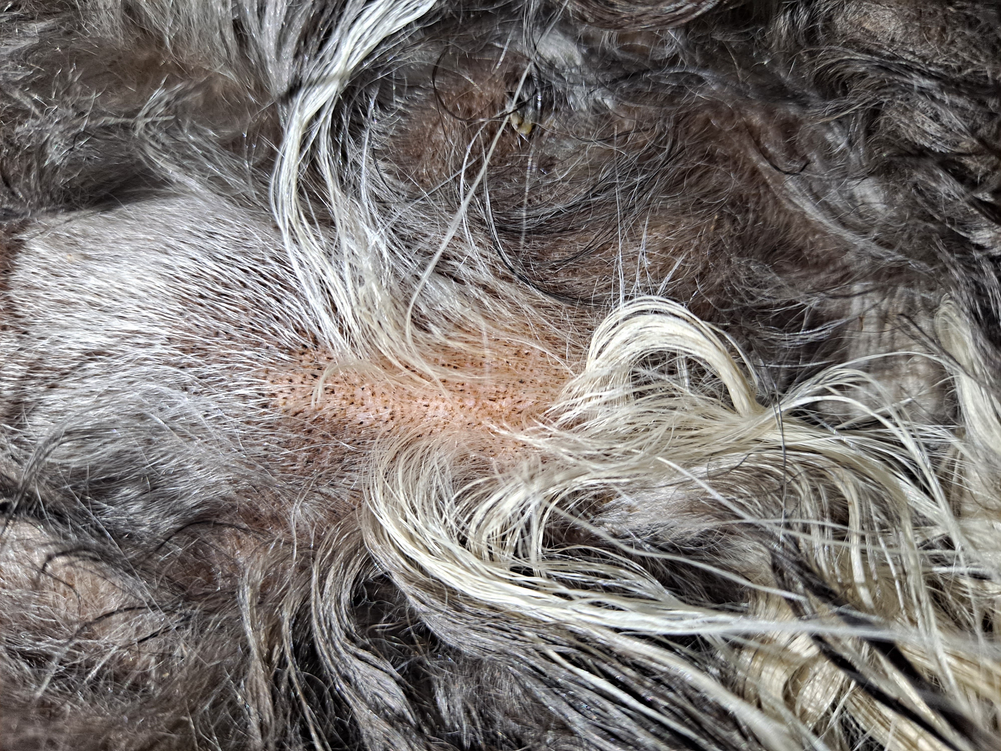 Since mid-February, she started to have lots of dead skin around her neck and head areas and there are so much of it that her dead skin shreds all over the bed and the couch. And her skin gets dark like in this picture.