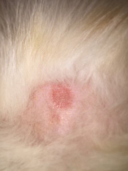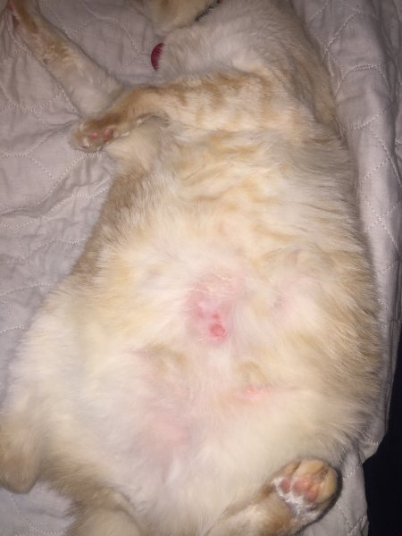 All my animals are treated with Revolution, and my dog is treated with Trifexis for heart-worm preventative. This was given a little over 2 weeks ago last. I've checked them all for fleas and since Carter and Simon especially are pretty white, I wasn't able to see any. Carter's skin doesn't look red or irrirtated anywhere other than that spot on his stomach. I can touch the area and he doesn't get mad, so it doesn't appear to hurt him.
