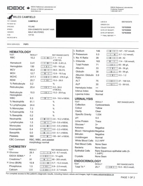 P.S. I understand the vet's position now: start with putting him on good food and monitor his levels and then decide on insulin or further visits. I guess that makes sense. They are also sending me his lab reports by email.