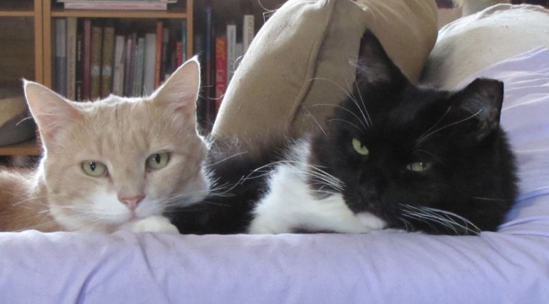 And, yes, Wally is adorable and the sweetest kitty. He literally now comes and asks for testing, purrs through the whole thing and makes life so much easier that way. He alerts me when his sugar is low by begging for food and has prevented going hypo because of this. Here's a photo of him with his best friend, Sebastian.