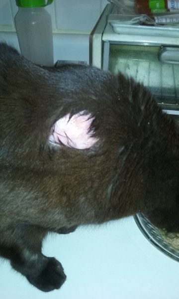 My Summer has places on her that just show up here and there that look like your kitty. Summers will be raw and then will eventually scab over. Although i suspect she has cushings because of her skin being so very thin and her fur not growing back in places. Summers raw spots are unsightly and were upsetting in the beginning but i have learned to except it and just deal with it the best i can. I put neosporin on the spot if needed and that helps it heal. I have not gotten summer tested for cushings but my vet suspects it and she has the signs. I have not gotten summer tested because i choose not to treat her with the drugs and if she has to have surgery i refuse to put her through that. Both are not a guarantee and are costly not to mention. I do believe however this is why summer is on a high dose of lantus. And lantus does sting her at times too but she is pretty good with it. If i download some pics to my computer of summers raw spots, i will show you.