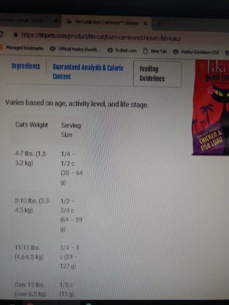 With this new insulin dosage, I'm going to go get her some fancy feast classics that everyone recommends. She's eating tiki cat now but I notice a whole lot of fish in it and it's a lot of water, not to mention too pricy for my budget. I will still be feeding her the tiki cat dry along with the fancy feast classics. I'm posting pictures of the nutrition facts/calorie content of both foods. She usually eats wet food three times daily. And dry food at feeding times. Im trying to cut the kibble out. I obviously need some help trying to get her diet correct and I thought with the new dose of insulin this will be easier for me to do now. She went from 2 units twice a day to one unit twice a day. Like I said she gets fed three times a day but doesn't usually finish her whole meals and grazes all day until it's gone or it gets dried out. She weighs 12 pounds.