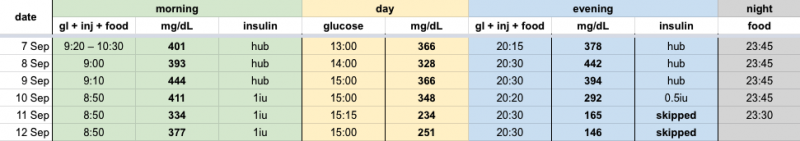 His blood sugar was over 400 when diagnosed and he weights 5.2kg, so the vet prescribed 2IU injections twice a day. I did it dutifully for 3 days (starting Sep 1) but he crashed quite hard after the 6th injection in the evening, showing all the "moderate hypoglycemia" symptoms from this thread. I applied honey onto his gums and rushed to a hospital where they tried to do glucose curves along with calibrating insulin injections for two days, but his blood sugar was all over the place, almost random. Plus he started getting aggressive, so we decided to take his home for a rest.