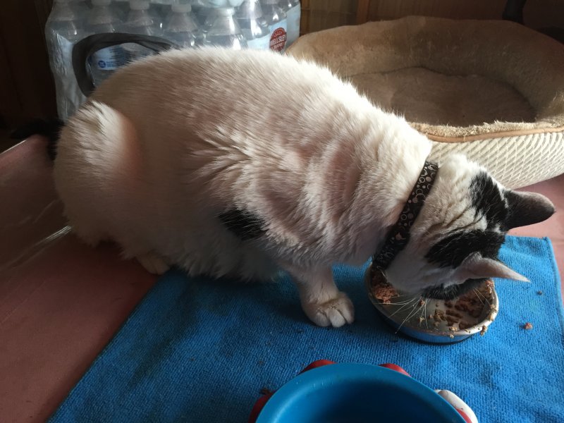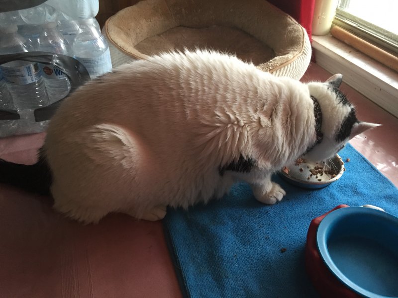 But there was a good size clump of urine as well as some man-size stools in his litter box this morning. He's eating, but he's not wild about minced or paté in any brand. Well, too bad Fatboy, get used to it.