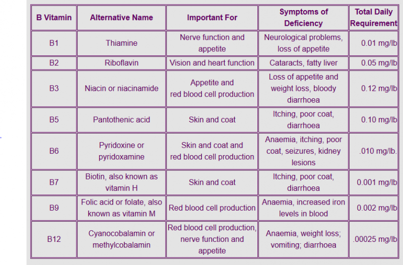 Also, I suggest you speak to your vet about using a B-complex supplement as a number of B vitamins are involved in production of red blood cells. Here's a helpful table from Tanya's Site showing the roles that different B vitamins play in the body (the whole page is a recommended read):