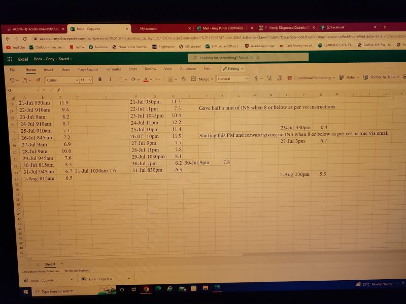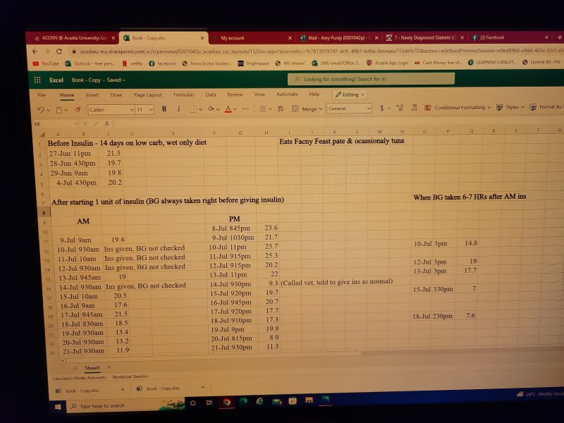 If you would like to set up our spreadsheet where we track our cats BG to see how the insulin is working and how low it's dropping in case you want advice here is the link , if you need help with it just ask