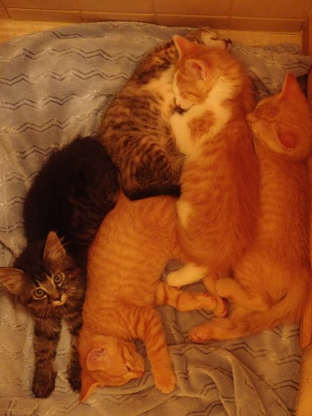 We've been fostering a litter of five kittens, and I'm taking the first two to the shelter today. I'll miss them terribly. I'm attaching a picture of them all in a cuddlehuddle.