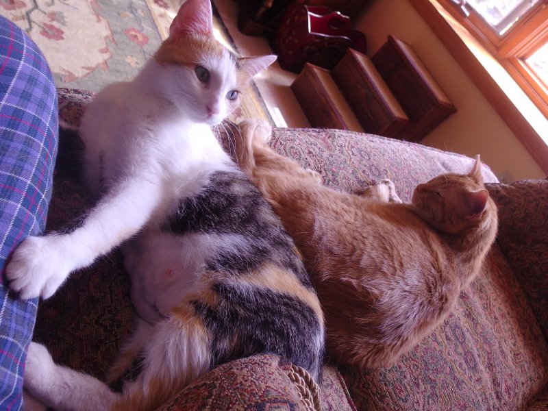 Thank you. Being around here on the board has actually helped me with that. I have worried what if they go to homes where they aren't loved enough, but I see here so much evidence that there are a lot of people who really bond with and nurture their kitties through their whole lives. Another happy thing to come of this experience is that we're failed fosters--while I was there with the kittens, I filled out the paperwork to adopt their momma! Her name is Moth; I'll attach a picture of her with Felix (she was just spayed as you can see from her tummy).