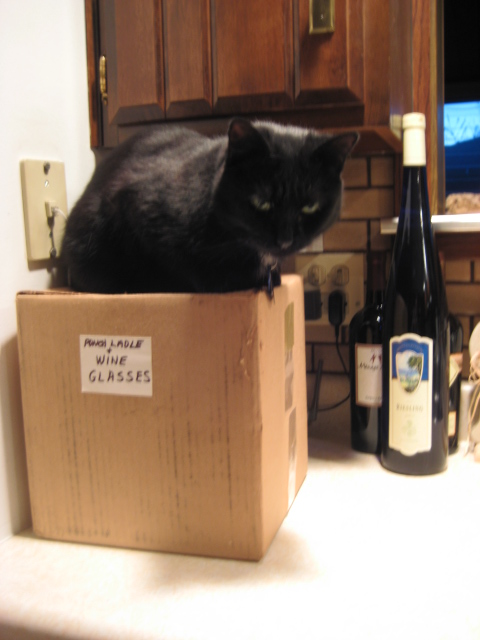 Molly's in the kitchen serving up drinks now. We have wine, catnip tea, tunaritas and mousetini's.