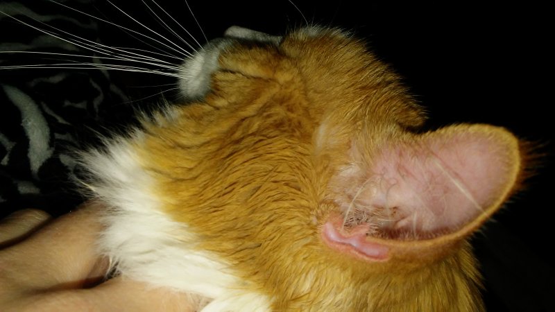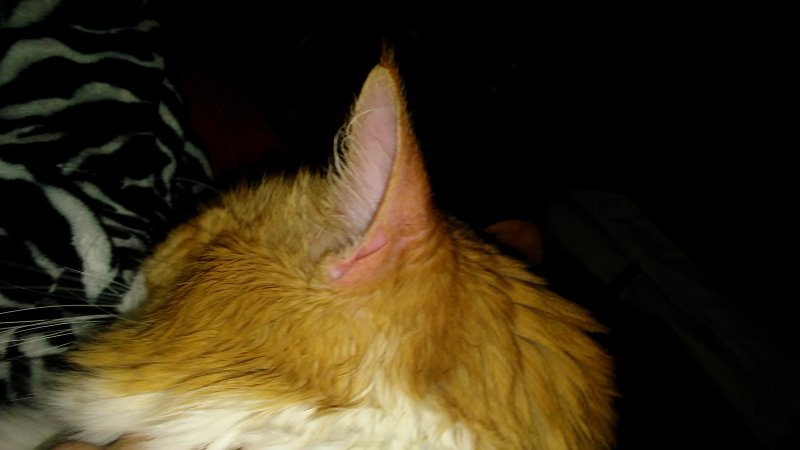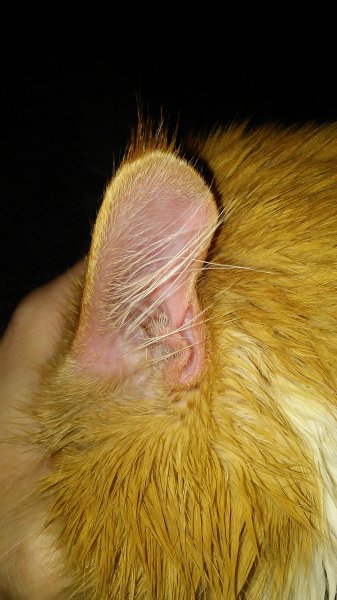 I am not sure how well you can see the redness. My camera sort of dulled it out a bit. It does look a bit swollen so perhaps he got stung by something when he was hiding...?? It is just the outer ear. I have looked and looked with a flashlight and the redness stops about a quarter inch from the canal. I did put a bit of olive oil on it as this is what I use when his hair is itching the inside of his ear. He has never had an issue with it before, but I put the OO after the redness showed. He will not let me touch it at all... It seems to be quite uncomfortable. I wonder if I could give him a small dose of Gaba just to ease that pain off a bit..??