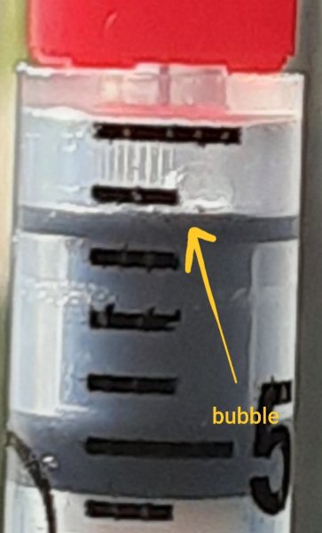 * Try to centre the single bubble directly under the needle if possible. (Easier to shift than when it's stuck to the side of the barrel.)
