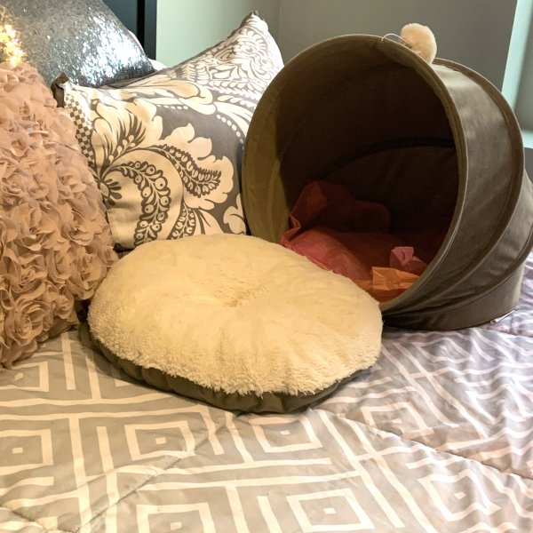I have this little partially covered cat bed (picture below). This is where he spends most of his time during the day. At night, he goes back-and-forth between sleeping inside of it and sharing my pillow.