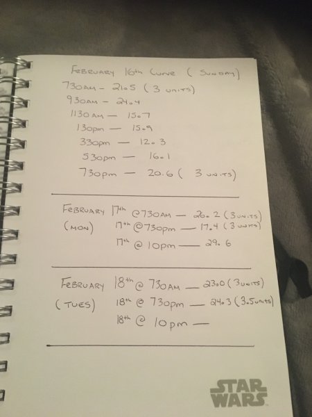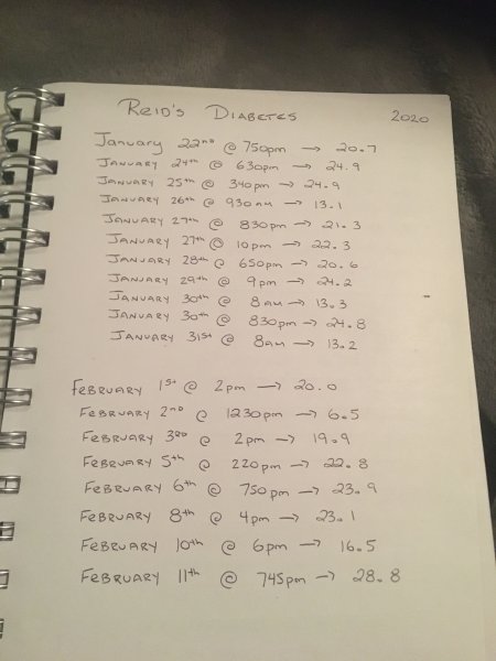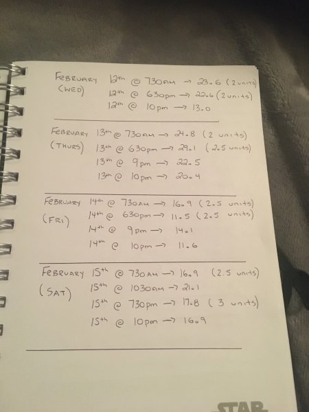 I ignorantly wasn’t paying attention and writing down his insulin dosages for tracking purposes because I was assuming his numbers would go down in a couple days. I got one low number on February 2nd and that was it. So, I started tracking his feed time / BG / and insulin properly February 12th and this is what we have so far. I’m at work in the day so I can’t test him until I’m home after 6.