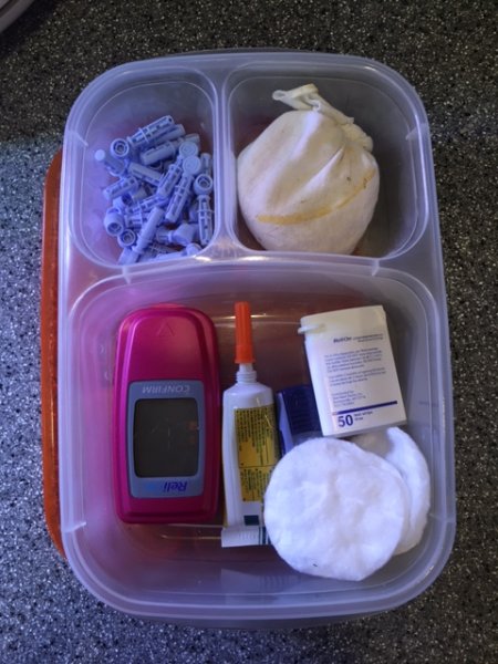 I was tidying up my kitchen this evening and thought "I'm so glad I found a way to keep Misha's diabetes supplies from ending up all over the place"--and then I thought "Maybe I should share what I'm doing in case it's helpful to anybody else." So here's a picture of how I keep Misha's stuff organized. I just got a cheap plastic lunch container and put the lancets in one compartment, the rice bag in another (don't worry, it's not dirty--it's just made from an old t-shirt), and the meter, strips, some cotton pads, and some neosporin with pain relief in the big one. It's nice to be able to put the lid on it and keep hair, etc. out of everything, and if I'm having a PJ party or something, it's easy to take the kit along to whatever room that's happening in. We're doing an OTJ trial right now, but I was also able to fit a few needles in when I was still doing injections. Does anybody else have a system for avoiding supply chaos?
