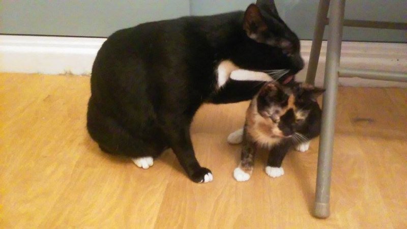 Well, just look at your handsome big boy helping care for your new baby. That's amazing... he's amazing, especially this early on in the adoption game. It's been my experience to expect a lot of hissing and growling and not getting along from the established felines. You do, indeed, have the nicest cats!