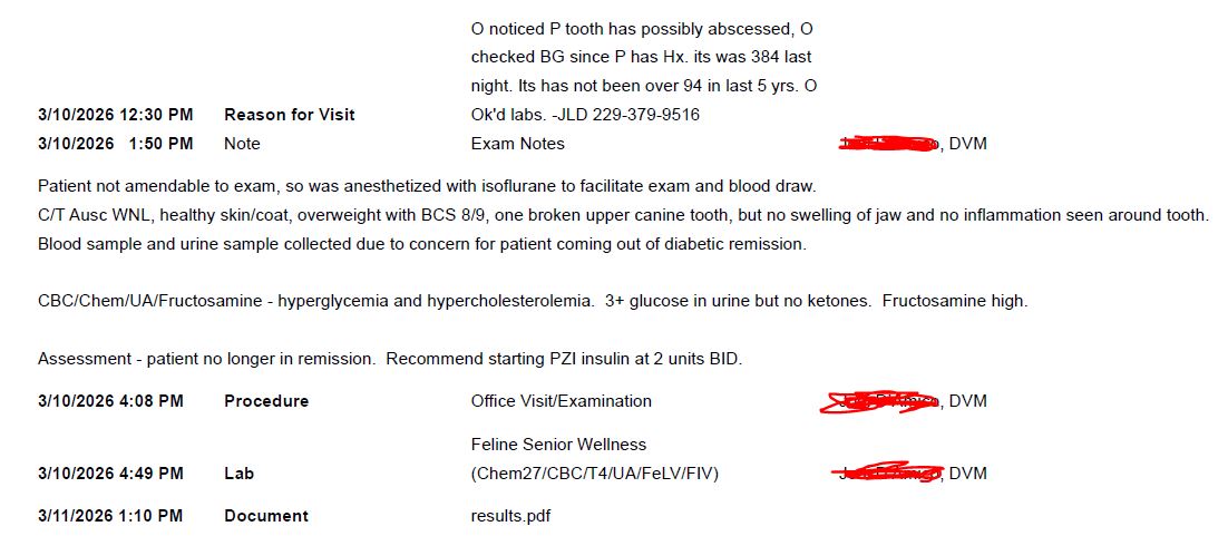 Hello all well its been 5 years and 2 months since yall helped me get Vengeance in remission after only being diagnosed thou he almost died last time because his kidneys had shut down... this time no issues with kidneys vet said everything except him coming out of remission suddenly is great for almost 13... thou year and a half ago he had pancreatitis but that didnt bring him out of remission oddly... so this all started on march 10th he had been acting like his broken fang was bothering him off and on so I was going to make an appointment to check on that... he had been acting normally no signs of anything else... so I have gotten lazy about checking his BG being hes been in remission for 5 years and when I do take it its 88-97 on the Relion ..its been since around January when I checked him last and it was 94 .....so no reason to check but around 3 am something told me to just check and I did and his BG was 384 scared the crap out of me.... so I stayed up all night till my vet opened was there when the doors opened to say FIND OUT WHATS WRONG ( sadly in the last few months I have lost 4 cats non diabetics and 1 on feb25th) so I was upset... took him in they did blood work and said #1 that they had to sedate him to get him cooperate lol that his BG numbers were 400( something I need to get the blood work trying to get it thru patient portal... they did a frutosamine to check being I was wondering if he had an abscess in his tooth causing the #'s up and they said no no infection ....but they gave him an anitbiotic shot anyways.....and said his fructosamine was like 400's so they said he had came out of remission ... and like last time handed me syringes and insulin and sent me on my way told me dont BG test him blah blah like last time.. this times hes on Prozinc they started him out on 2 units twice a day... ... I am going to have to remember how to upload speadsheet info its been a while.. but his numbers are staying in the 300's at shot time thou once it was 117 3rd day back on insulin... his curve at 6 hrs really doesnt drop much I did a curve the first night he was back on it and it was crazy town... I do check him right now with a new relion premier Blu I check him at 7am 7pm at food time and I also do a 1am ( being Im up so I can see if the drop is there and its usually NOT????) he has only lost 1/2 a lb in almost 2 years which I did change up his feed schedule last summer I had still been feeding him 4 small meals a day and it was killing me so I finally got him to agree to 2 large meals twice a day ( fancy feast pate or friskies pate ) I had to order an acutrack 3 being my vet said she will accept no numbers from anything else...being she wants me to a a blood curve at 10 days... so waiting for that to show up... I appreciated all your help last time and will now as well I would love to get him back into remission and back stable....as with all of your fur babues hes my child... ..now to try and figure out the spreadsheet again.. thanks in advance for all your help its very much appreciated...