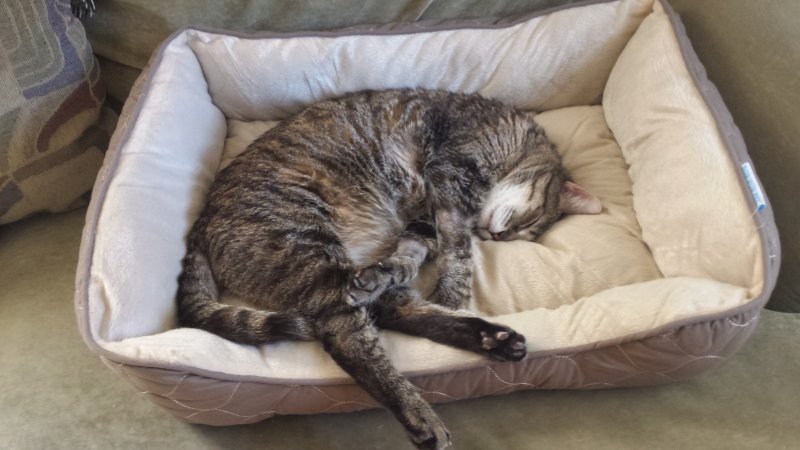 Just a little update. Snicky's been doing fairly well, has some ups and downs, but for the most part OK. Hope I didn't jinx myself. Here she is in her new bed we got her yesterday. It's a dog bed but she doesn't know that. She actually jumps up on the couch to lay in it. She hadn't been jumping much at all since she got sick. Gotta try and keep her going!