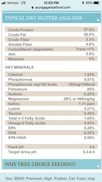 Wynsong epigen 90 is like 5-6% as is Dr elsley's clean protein chicken flavor.I am having the same experience and am also turned off by the Young Again customer service. Recently my cats both became ill concurrent with opening new bag of YA Zero Mature. After removing that food they've improved. They are now doing better on Origen (Fit & Trim for diabetic cat. It's 16 per cent carb, but low glycemic, I think. They also get low carb pate wet food x 2 per day. Both cats doing much better off the YA Zero Mature.